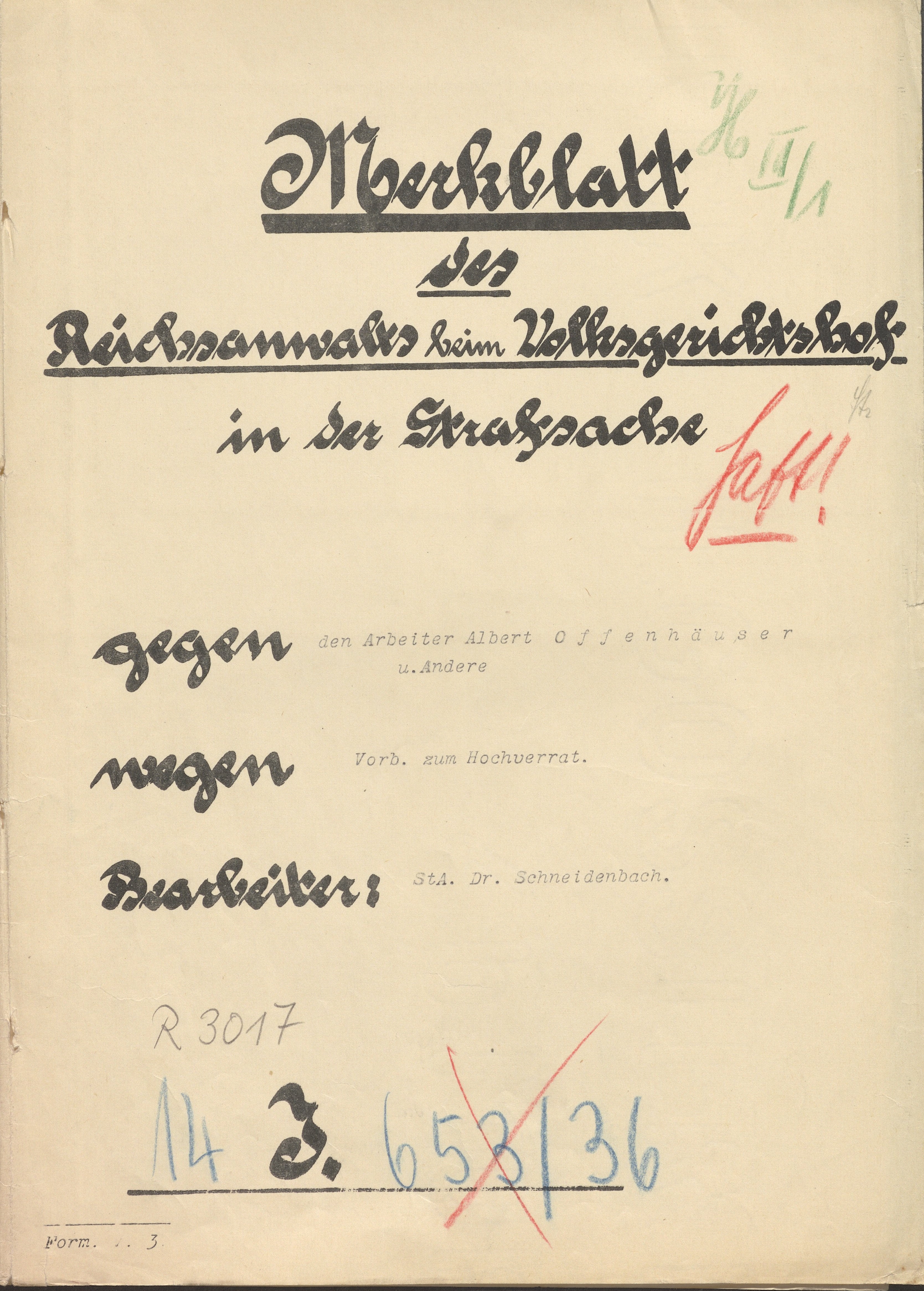 Im Herbst 1936 begannen Ermittlungen gegen Albert Offenhäuser und andere Personen wegen des Verdachts der Vorbereitung zum Hochverrat. Der Bezug auf diese Straftat lässt darauf schließen, dass Offenhäuser mit illegalen kommunistischen Kreisen in Verbindung gebracht wurde. Der Reichsanwalt beim Volksgerichtshof ermittelte in diesem Zusammenhang auch wegen des Verdachts auf Landesverrat (d.h. Spionage bzw. Weitergabe von Staatsgeheimnissen). Der Verdacht auf Landesverrat war entstanden wegen Offenhäusers Beziehung zu einer Schweizer Staatsbürgerin namens Frey. Nach Rückfrage bei verschiedenen Stellen, unter anderem beim Geheimen Staatspolizeiamt in Berlin, kam der Reichsanwalt zu der Überzeugung, dass die Beziehung zu dieser Frau rein persönlicher Natur war; der Verdacht auf eine landesverräterische Tätigkeit ließ sich jedenfalls nicht erhärten. Daraufhin gab der Reichsanwalt die Sache Offenhäuser an untergeordnete Instanzen ab. Über den schlussendlichen Ausgang des Verfahrens ist mangels Quellen nichts bekannt. Vermutlich wurde es Ende 1936 mangels Beweisen eingestellt; eine längerdauernde Haftstrafe wurde jedenfalls nicht verhängt. Während des laufenden Ermittlungsverfahrens befand sich Offenhäuser in Haft.